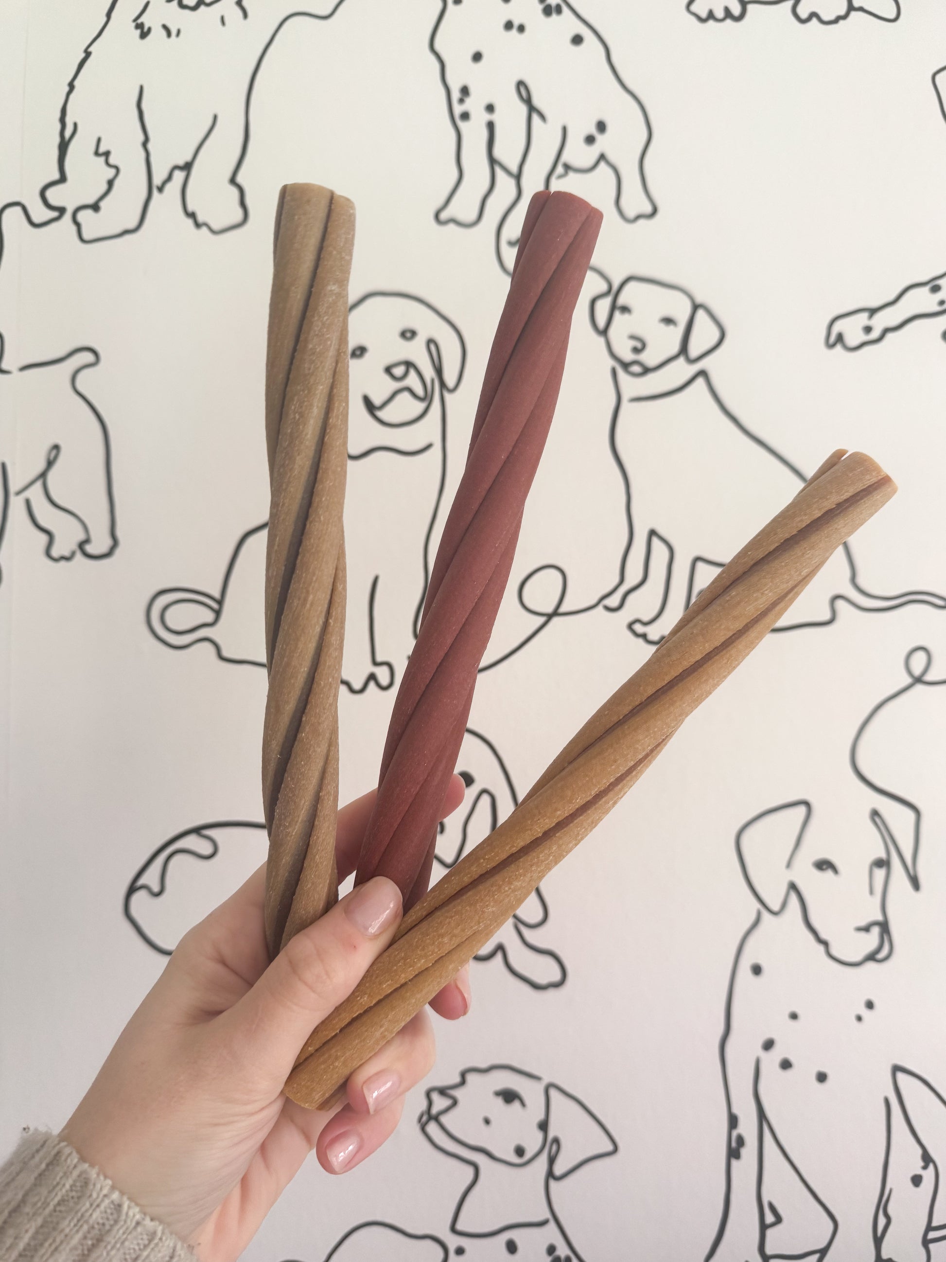 Our stock of fruit and vegetable chews are 100% natural, made from a base of sweet potatoes and peas. They are just as yummy as all our other items, and are great to mix things up for your pup-pal with something a little different.